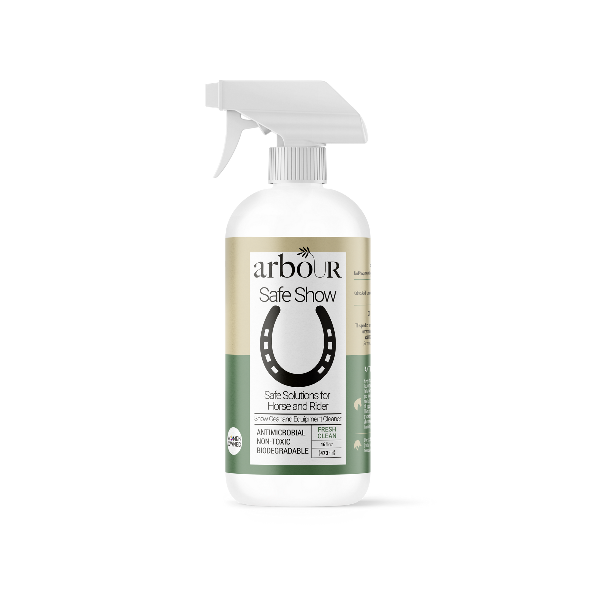 Keep that helmet, safety vest, show trunk, boots and show gear looking clean and odor free with our commercial-grade, plant-based ‘all around the barn’ cleaner. Trusted by vets, grooms and riders, this pro-strength formula can be safely used on plastic, metal, wood, fabric and other porous and nonporous surfaces, making it a must have for all types of rider and horse gear around the tack room or show facility. This antimicrobial formula has over 14 years of testing and can be trusted to safely neutralize a broad spectrum of possible bacteria, eliminate foul odors at their source, and remove stains —all without harming the people, pets, and planet we love.
